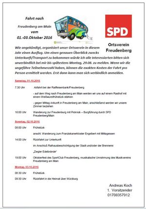 SPD Ortsverein Freudenberg/Oberpfalz fährt vom 01.10.- 03.10.2016 nach Freudenberg am Main.
