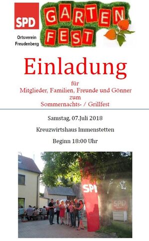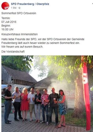 Mittlerweile zum viertenmal veranstaltete der SPD Ortsverein Freudenberg sein Sommerfest. Bei guter Stimmung und sommerlichen Temperaturen verwöhnten wir unsere Gäste und Mitglieder mit ihren Familien. Für Speis und Trank sorgten, da Müllerl Tom und die Kreuzwirtshauswirtin Kristin. Eingefunden hatten sich auch die politische Prominenz aus unserem Landkreis, die immer mehr werden, das ist gut so. Unser Ortsvorsitzender Koch Andi begrüßte uns und führte mit uns ein politisches Quiz durch. Gute Resonanz durch unsere Mitglieder und ihre Familien war auch gegeben, das uns, als SPD Vorstandschaft sehr gefreut hat.